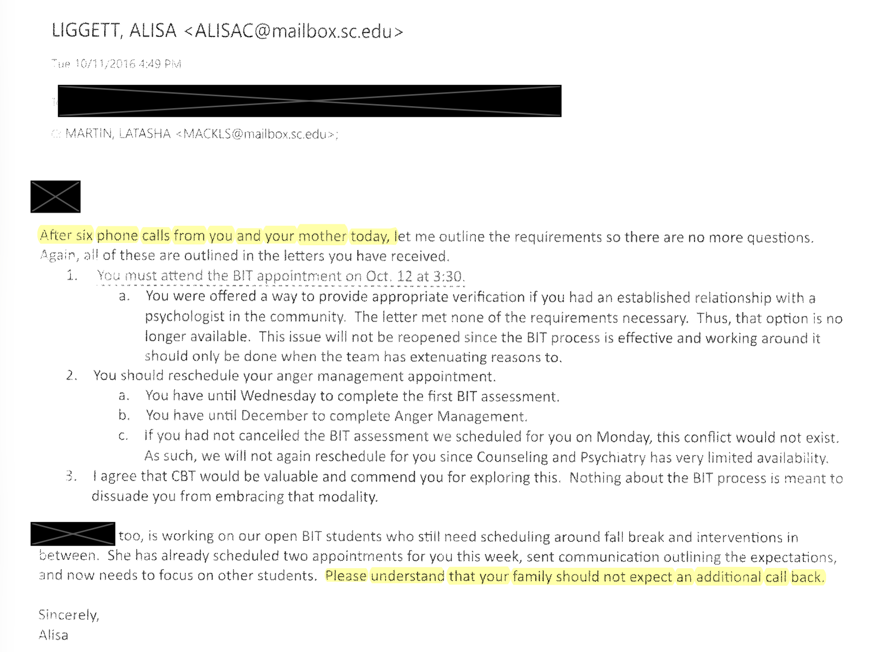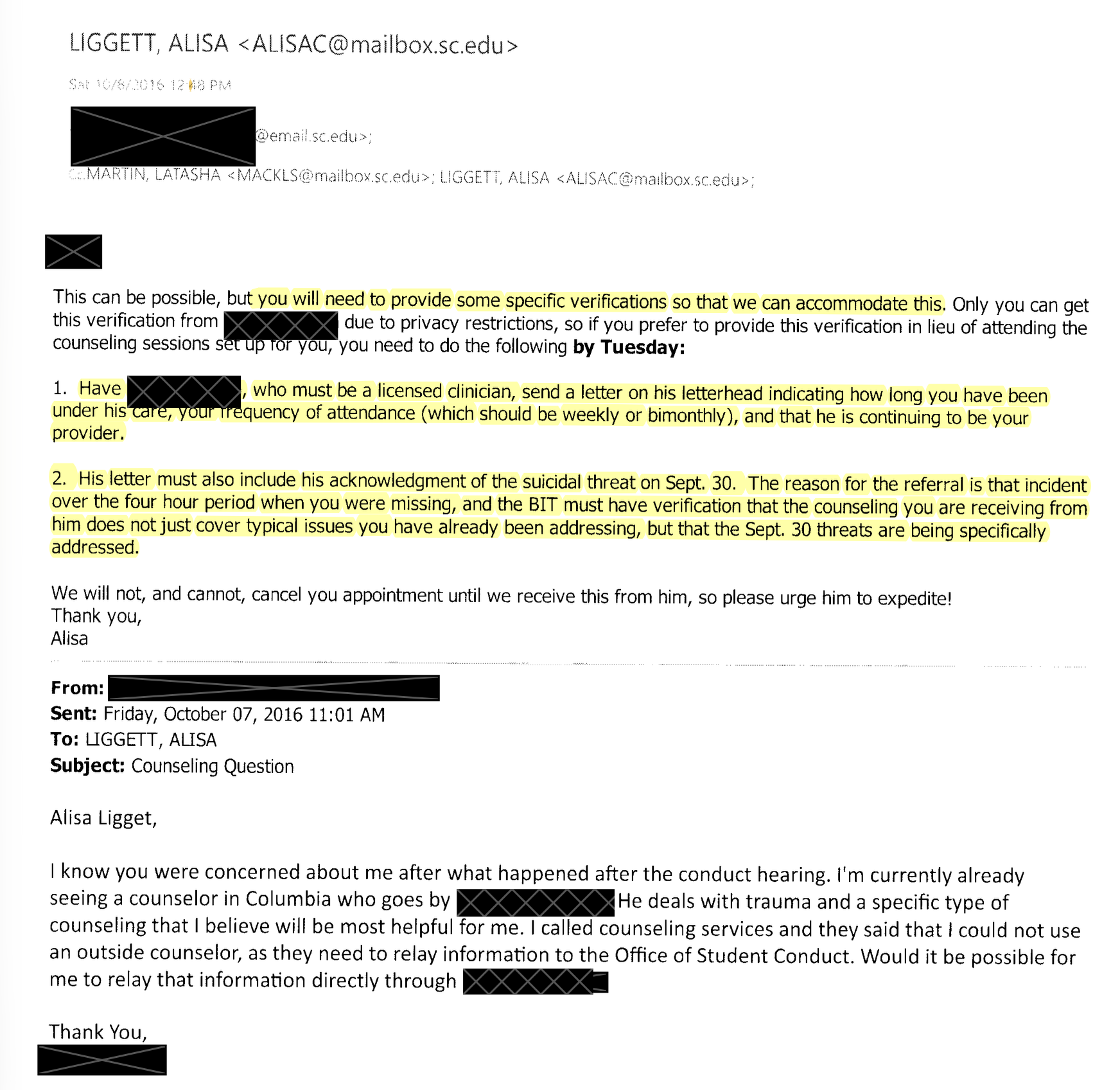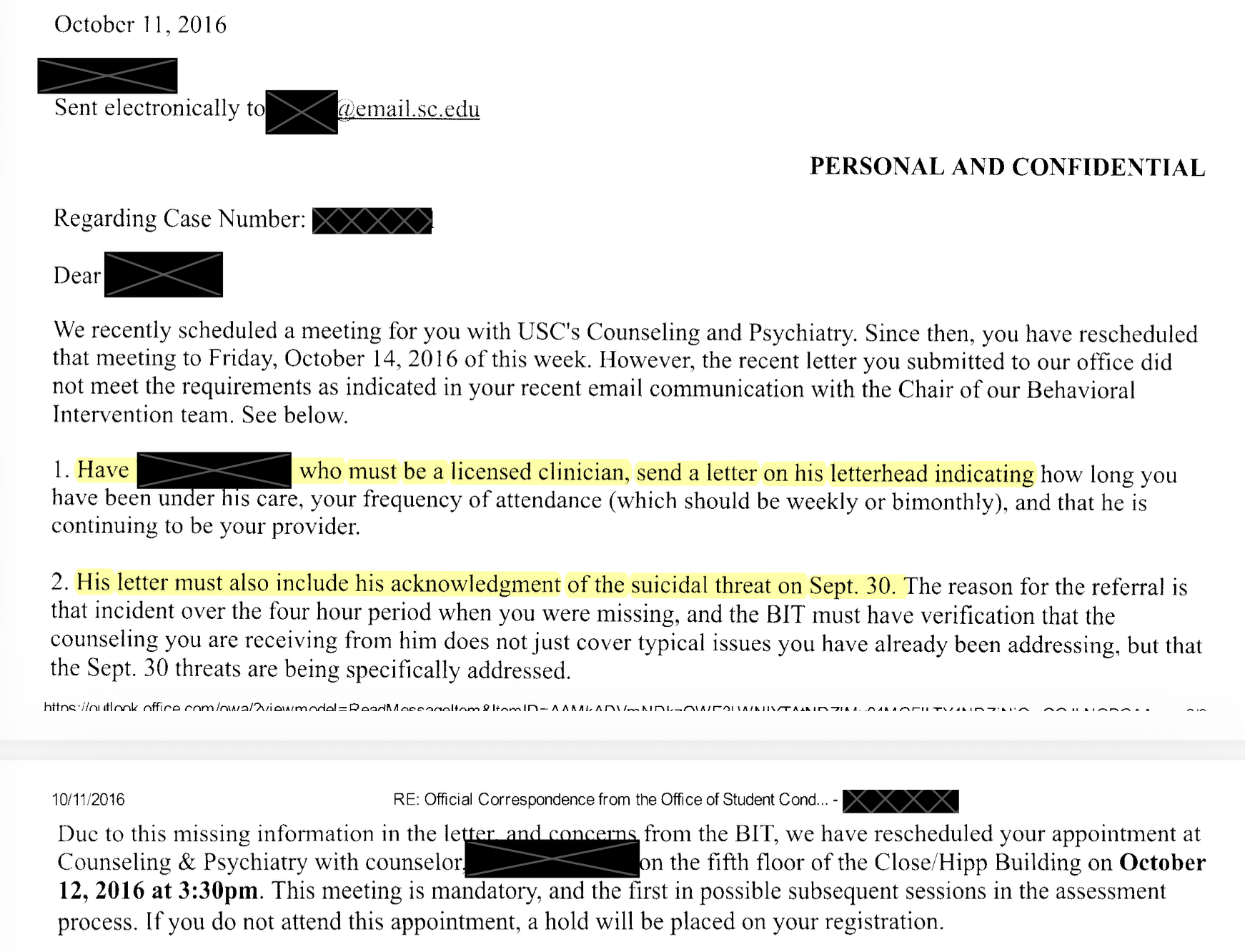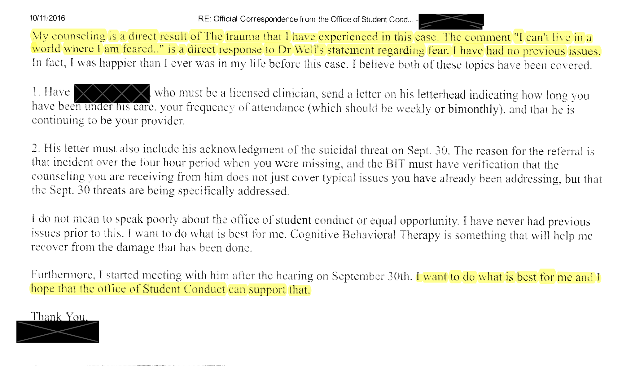 "1. Have [your counselor], who must be a licensed clinician, send a letter on his letterhead indicating how long you have been under his care, your frequency of attendance... and that he is continuing to be your provider. 2. His letter must also include his acknowledgment of the suicidal threat on Sept. 30."