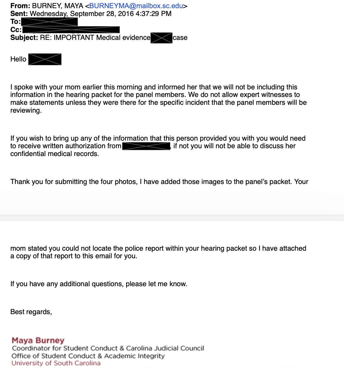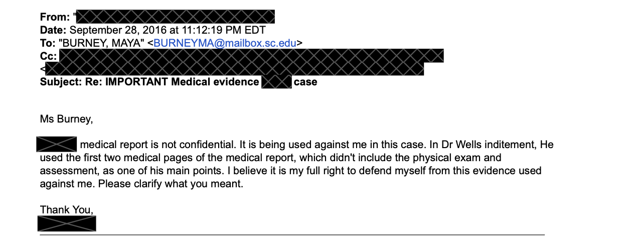 The administration attempts to block the student from discussing medical evidence by claiming they need written authorization from the other party, despite the fact that the university was already using those same records as primary evidence against the student.
